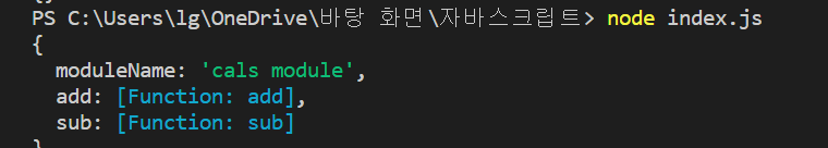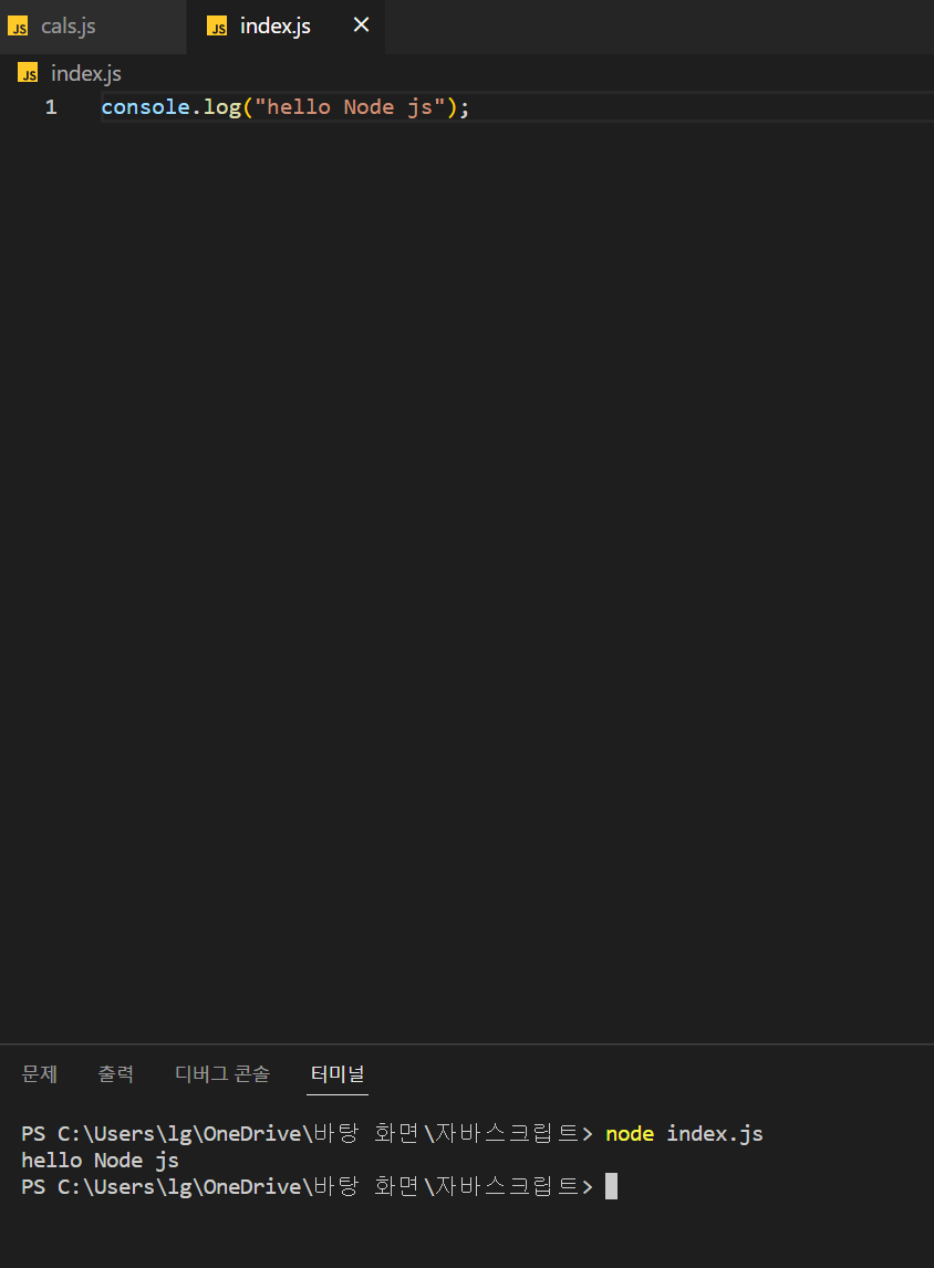 powershell을 열면 위와 같이 폴더의 경로가 다 나온다. 여기에다가 node 파일명 을 입력하면, 위와 같이 코드가 실행되는 것을 볼 수 있다.