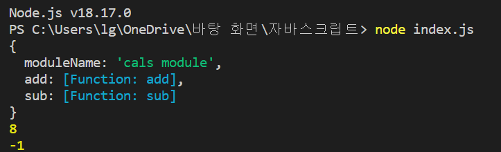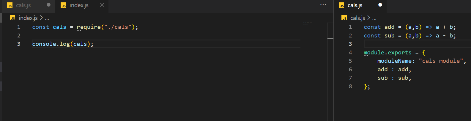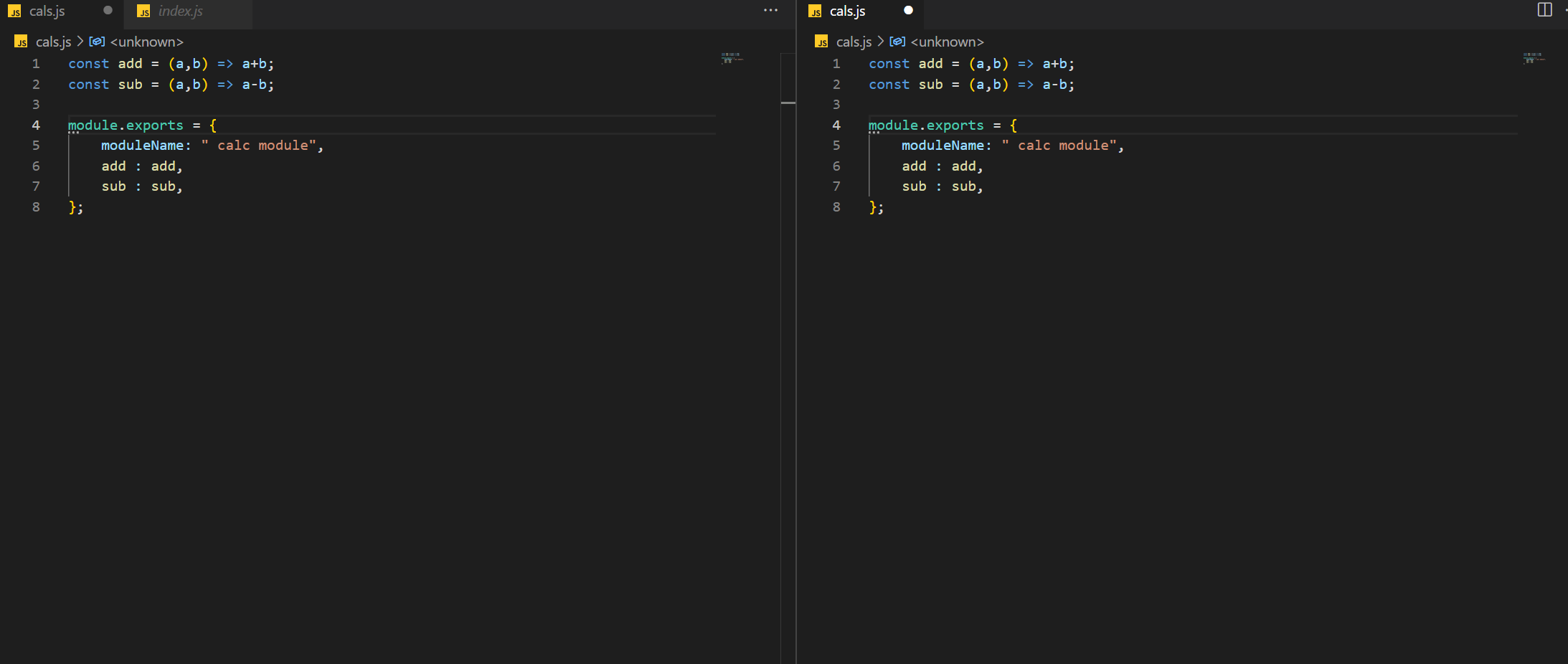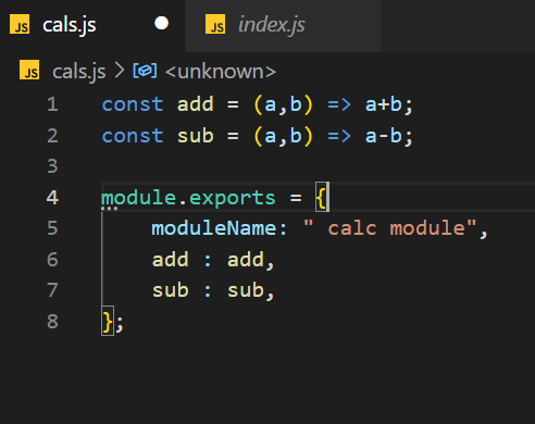 우선, cals.js파일에 위와 같이 모듈을 만들어준다. moduleName은 모듈명을 나타내고, add와 sub는 모듈 내의 함수를 의미한다.