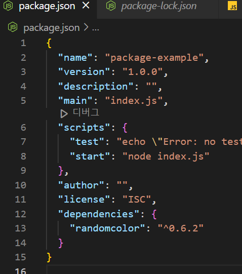 위 코드에서 패키지 설치 이후 randomcolor을 추가된 것을 볼 수 있다.