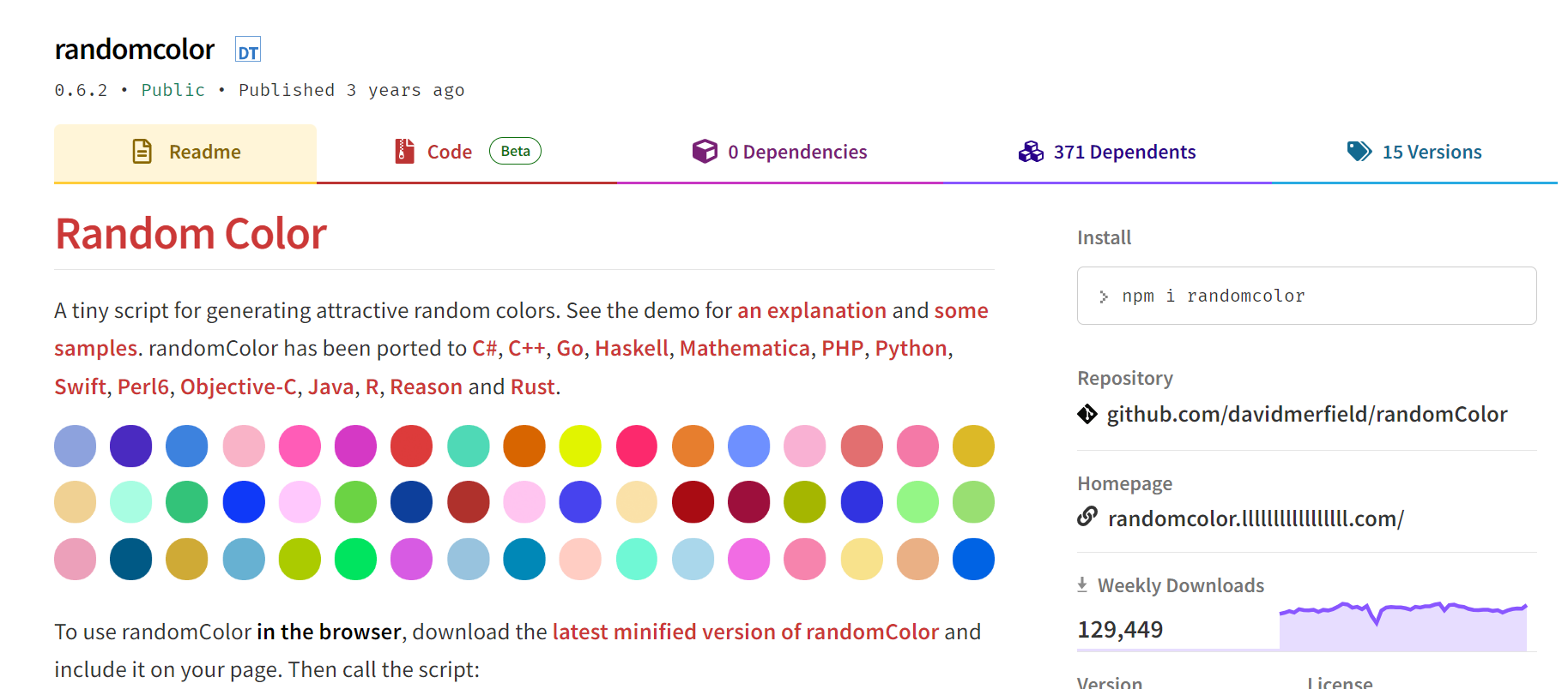사이트에 들어가서 randomcolor을 검색하고 제일 위에 뜨는 모듈을 클릭한다.