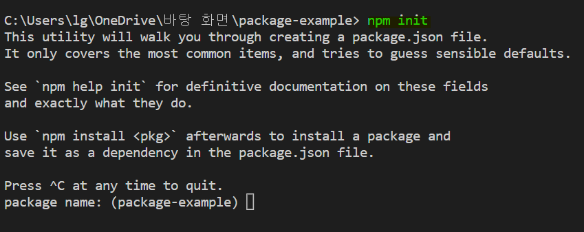 나는 패키지명을 package-example로 지었고, 나머지는 입력할 것이 없으니까 다 엔터를 쳤다. 그러면 이제까지 입력받은 정보를 보여주면서 맞냐고 물어보는 창이 뜨는데, 여기서 yes를 누르면 package.json 창이 생성된다.