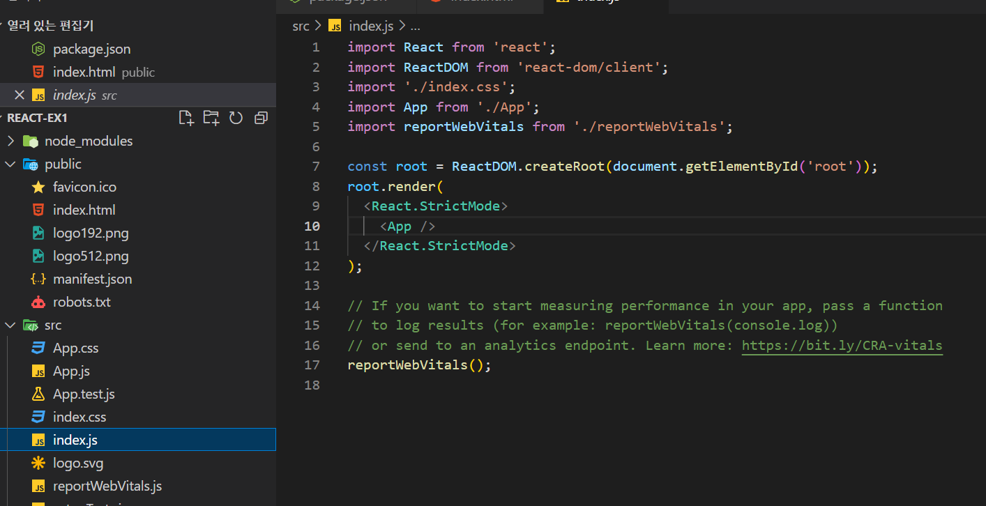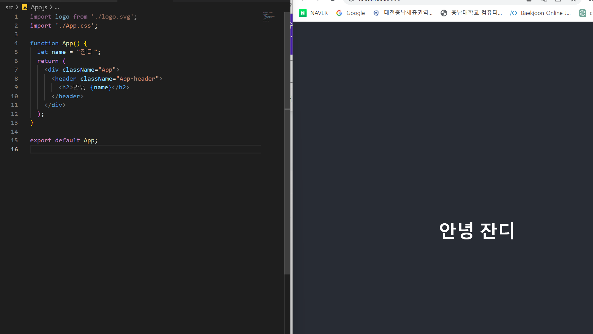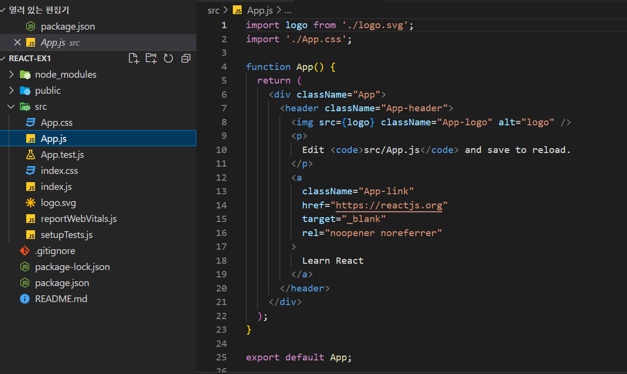 App.js를 보면, 위에 실행되었던 창의 html이 있는 것을 볼 수 있다.