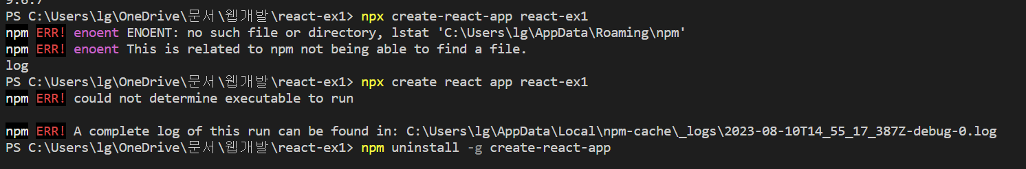 그래서 구글링해보니, 리액트를 삭제했다가 다시 다운로드 하라고 해서