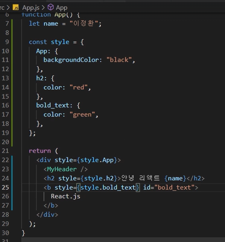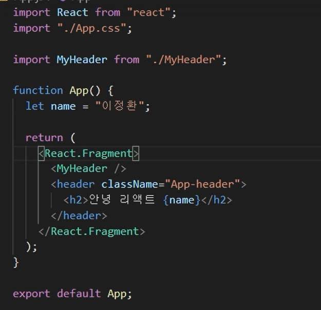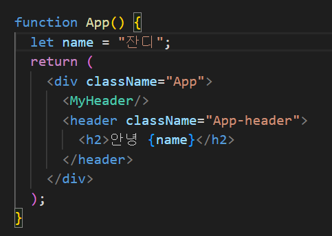 그 다음 App.js에 들어가서 위와 같이 import 한 후 코드에 MyHeader 컴포넌트를 추가합니다.