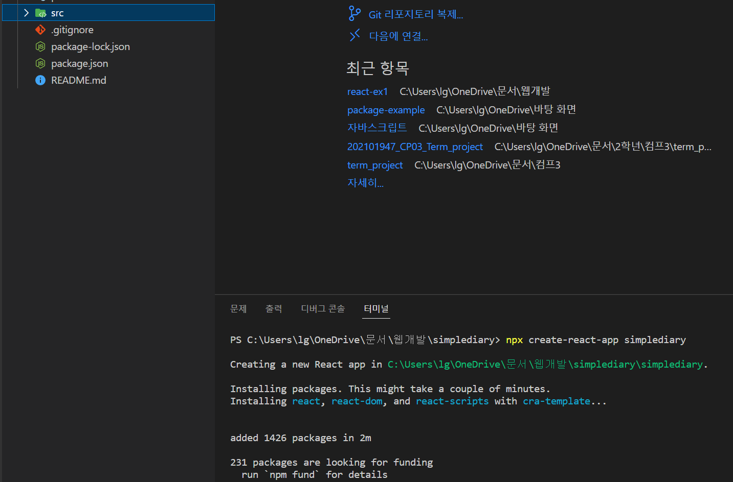 원하는 곳에 새 폴더를 만들고, npx create-react-app 폴더명 을 명령어로 입력한다.