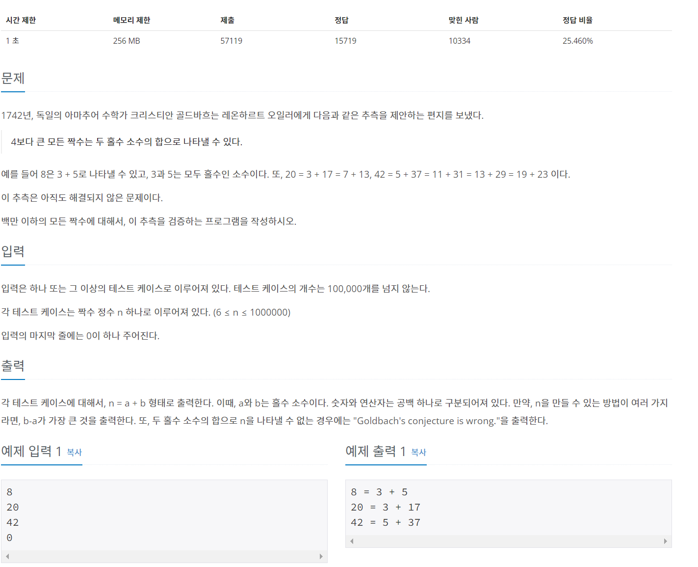 짝수인 수를 소수인 두 수의 합으로 나타내라는 문제이다.