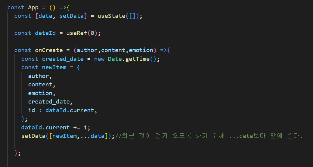 setData([newItem,...data]);//최근 것이 먼저 오도록 하기 위해 ...data보다 앞에 쓴다.