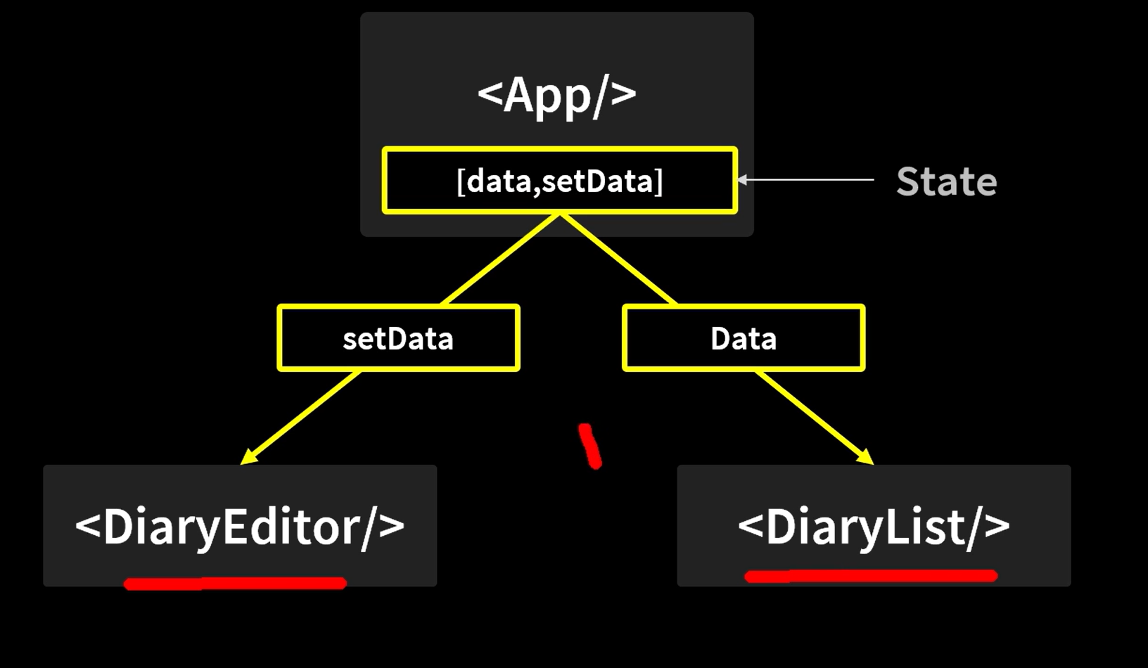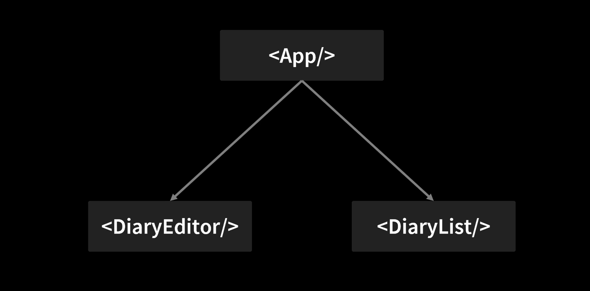 현재는 이러한 상태이다. 우리는 DiaryEditer에서 쓴 내용을 DiaryList에 추가를 해야 한다. 리액트에서는 같은 레벨에서 데이터를 주고 받을 수 없다.