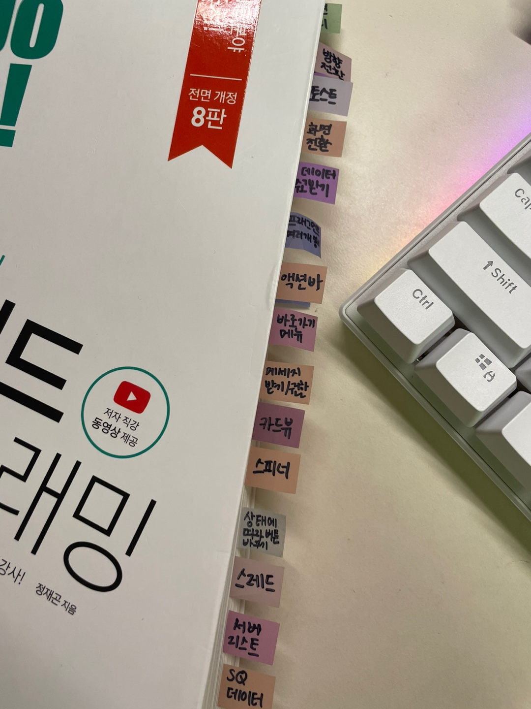 나는 나중에 프로젝트를 할 때를 대비하여, 기능들을 배울 때마다 저렇게 인덱스로 표시를 해 두었다. 이렇게 하니까 책의 흐름도 더 잘 알 수 있었고, 강의 도중 이전에 배웠던 헷갈리는 기능들을 찾기 수월했다.