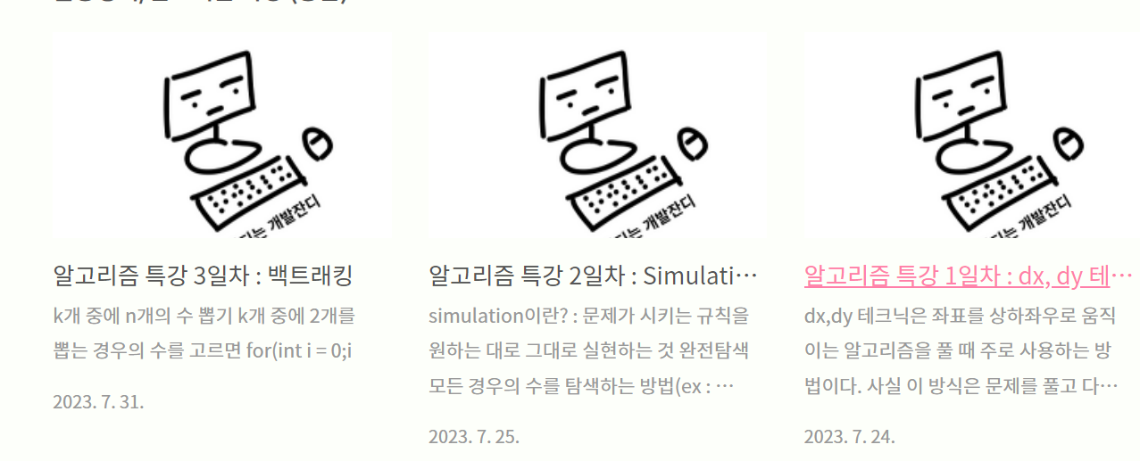 알고리즘특강 중급반 수업내용인 dxdy테크닉, simulation, 백트래킹 개념을 블로그에 정리하며 배운 것을 더욱 깊게 이해하기 위해 노력했고, 위 개념을 사용해야 하는 문제를 풀어보면서 활용 능력을 길렀습니다.