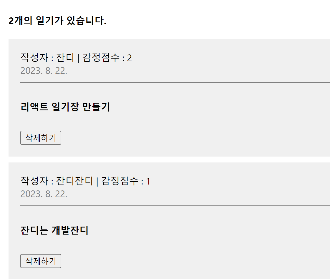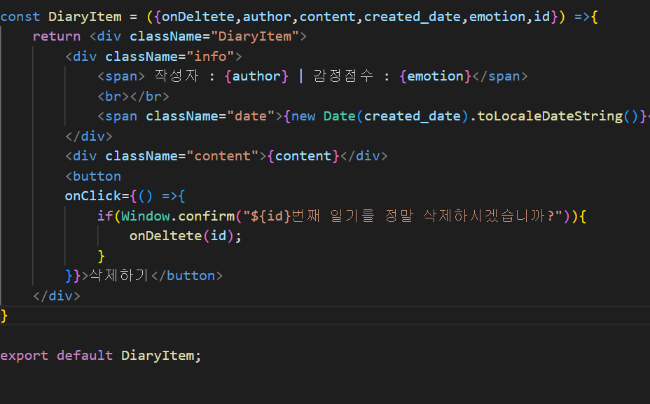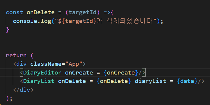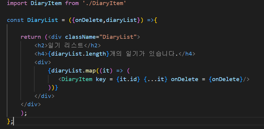DiaryList도 위와 같이 수정한다. DiaryItem 컴포넌트를 호출 할 때 받은 onDelete를 추가한다.