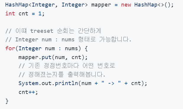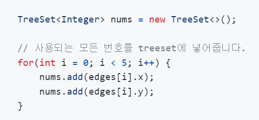 위와 같이 사용되는 모든 수를 TreeSet에 넣은 후(중복되는 수들은 거르고 , 수들을 정렬해서 저장하는 역할을 한다.)