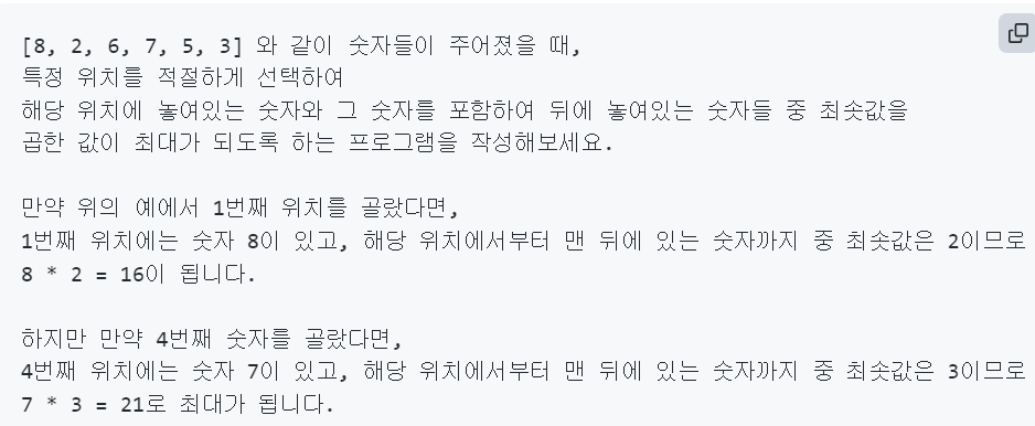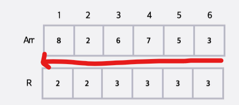하지만 위와 같이 끝에서부터 최솟값을 구해나가면서 왼쪽으로 가는 과정을 거쳐 R이라는 배열을 하나 더 만든다면 특정 위치가 주어졌을 때 Arr의 해당 인덱스 값과 R의 해당 인덱스 값을 곱하면 바로 원하는 값이 출력되어 시간복잡도가 O(1)이 된다.