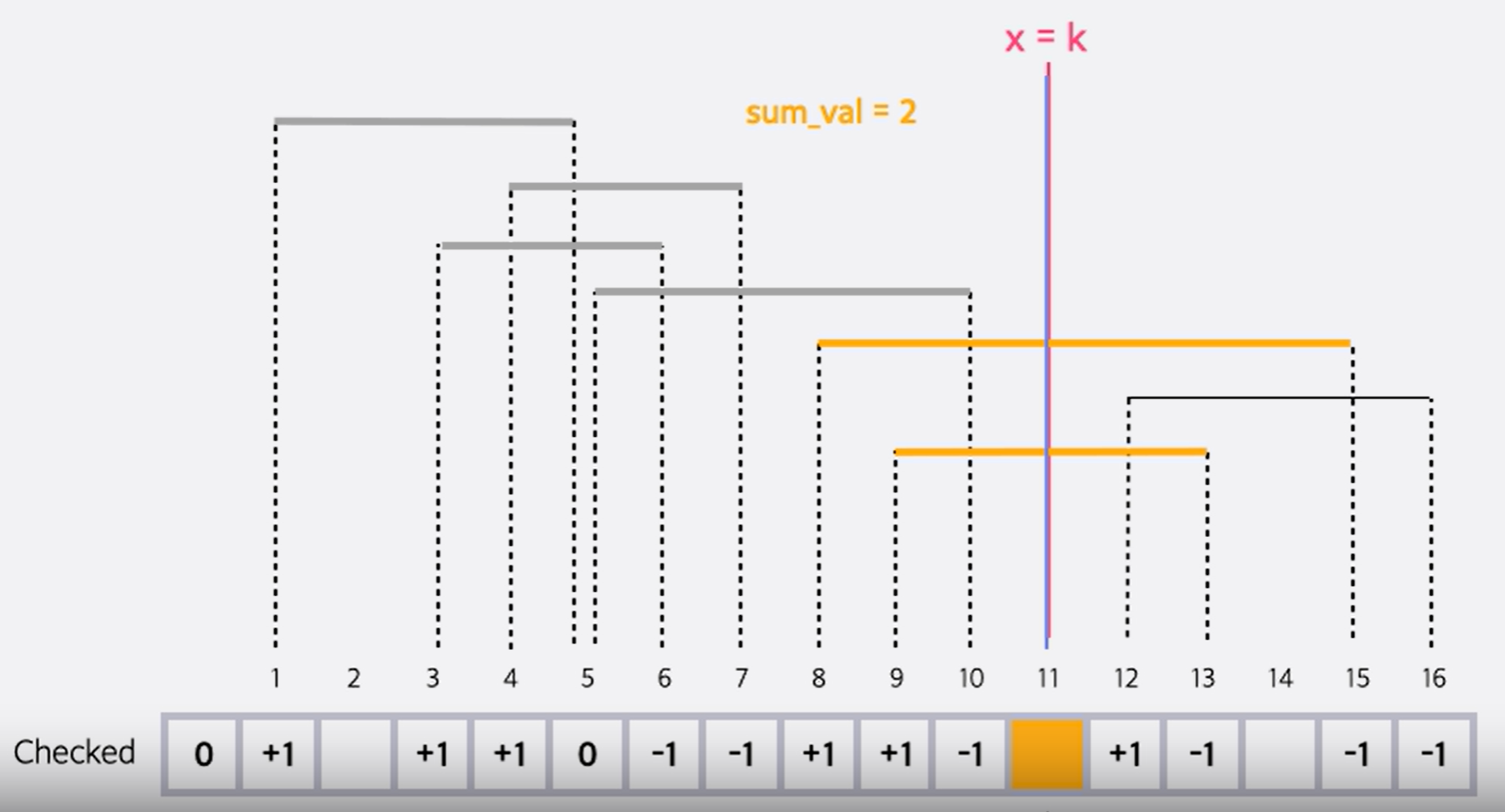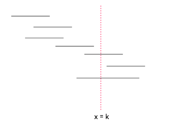 이와 같이 직선의 가장 왼쪽 부분에는 +1을 하고 오른쪽 부분에는 -1을 하고, 0부터 k까지 계속 덧셈을 하면 직선 하나가 지나가면 +1과 -1이 더해지므로, 값에 영향을 미치지 않는다.(0이 더해지므로)