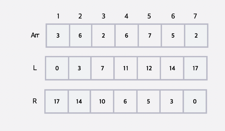 위와 같이 L과 R의 배열을 만들고, L은 해당 인덱스보다 앞의 인덱스와의 차이 + L[인덱스-1]의 값을 의미하고, R은 해당 인덱스보다 뒤의 인덱스와의 차이 + R[인덱스 +1]의 값을 의미한다.