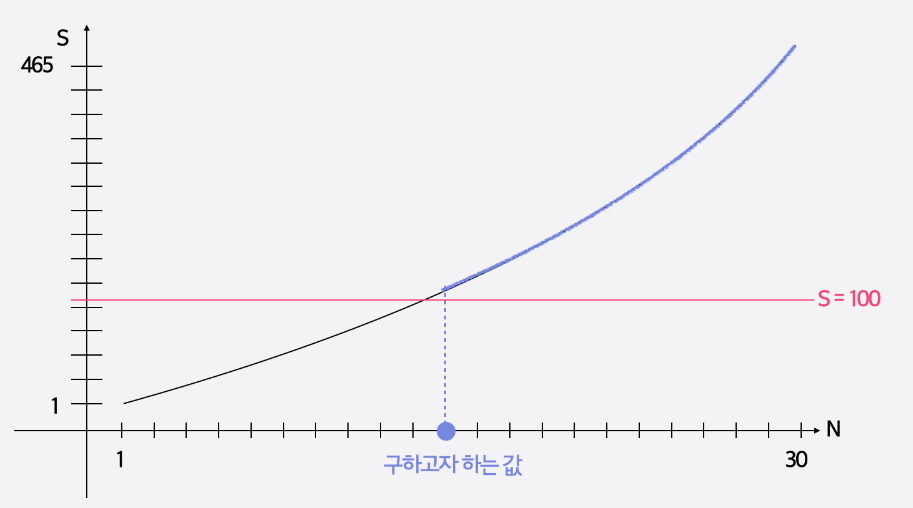 이 때 주의할 점은 left값이 s보다 작을 때의 최솟값을 구하는 것이므로, 만약 mid의 합이 s보다 작다면, mid + 1의 합이 s보다 큰지 알아본다. 크다면, 현재의 mid가 답이므로 이를 출력하고 break한다.