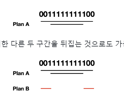 첫번째 방식과 같이 전체를 뒤집은 후, 특정 구간을 뒤집는 것도 가능하지만, 밑에처럼 원하는 배열과 다른 구간만 뒤집는 경우도 가능하다. 어떤 수를 뒤집고, 또 뒤집으면 원래의 자기 자신으로 돌아오므로, 이와 같은 반복은 최대한 일어나지 않게 하는 것이 좋다. 따라서 일치하지 않는 문자의 구간의 수가 최소한의 횟수와 같다고 볼 수 있다.