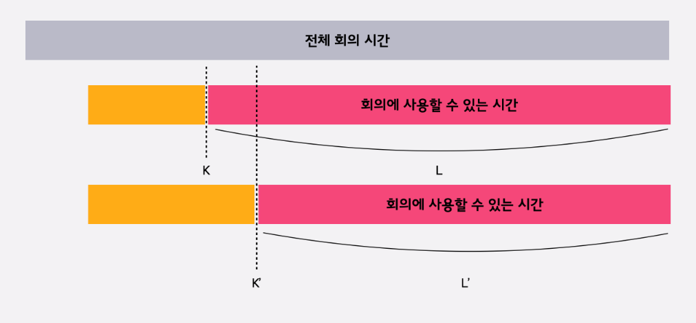 이 방법이 가능한 이유는 k가 짧을수록 사용할 수 있는 회의시간이 길어지기 때문입니다.(k를 작은 것부터 하나씩 탐색함으로서 최대한 효율적으로 풀 수 있도록 하였다.)