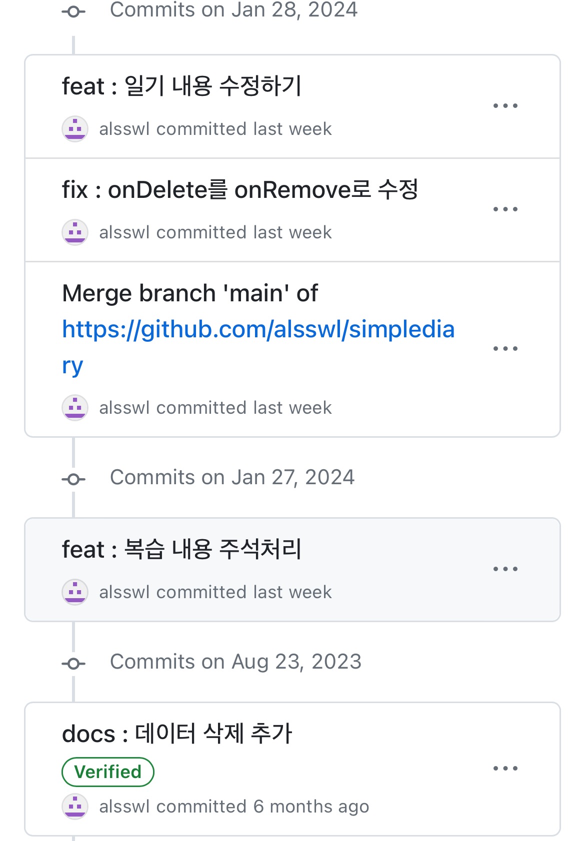 카테고리 없음 2024 동계 모각코 활동정리 6회차 by 잔디🌿 2024. 2. 3. 이제까지 했던 클론코딩 내용을 깃에 정리하였다위와 같이 readme 도 정리하였고 위와 같이 commit 메세지 규칙으로 정리하였다 공유하기 게시글 관리 잔디는 연구잔디