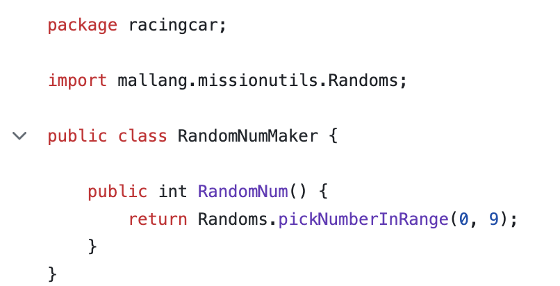 원래는 위와 같이 랜덤인 수를 만드는 클래스를 만들었었다. 하지만 이 클래스는 단순한 유틸리티 메소드만 가지고 있기 때문에 클래스화가 필요하지 않는 것 같다고 하셨다.