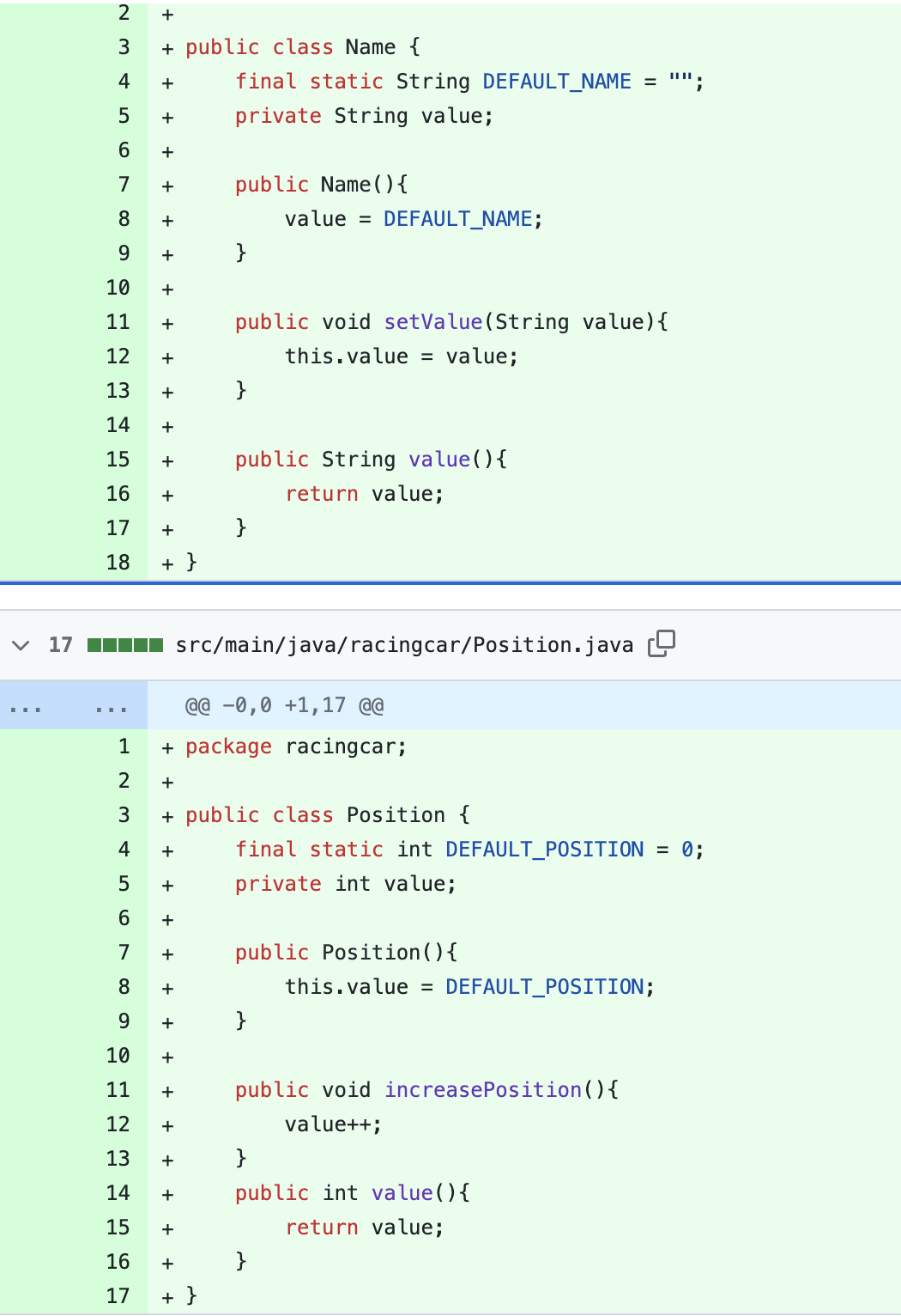 객체지향 관점에서는 Car객체 안에 있는 Name과 position은 변수로 선언하는 것이 아니라 데이터 운반 목적으로 사용되는 Name과 Position 클래스를 만들어서 각각의 객체로 다뤄야 한다는 답변을 받았다.