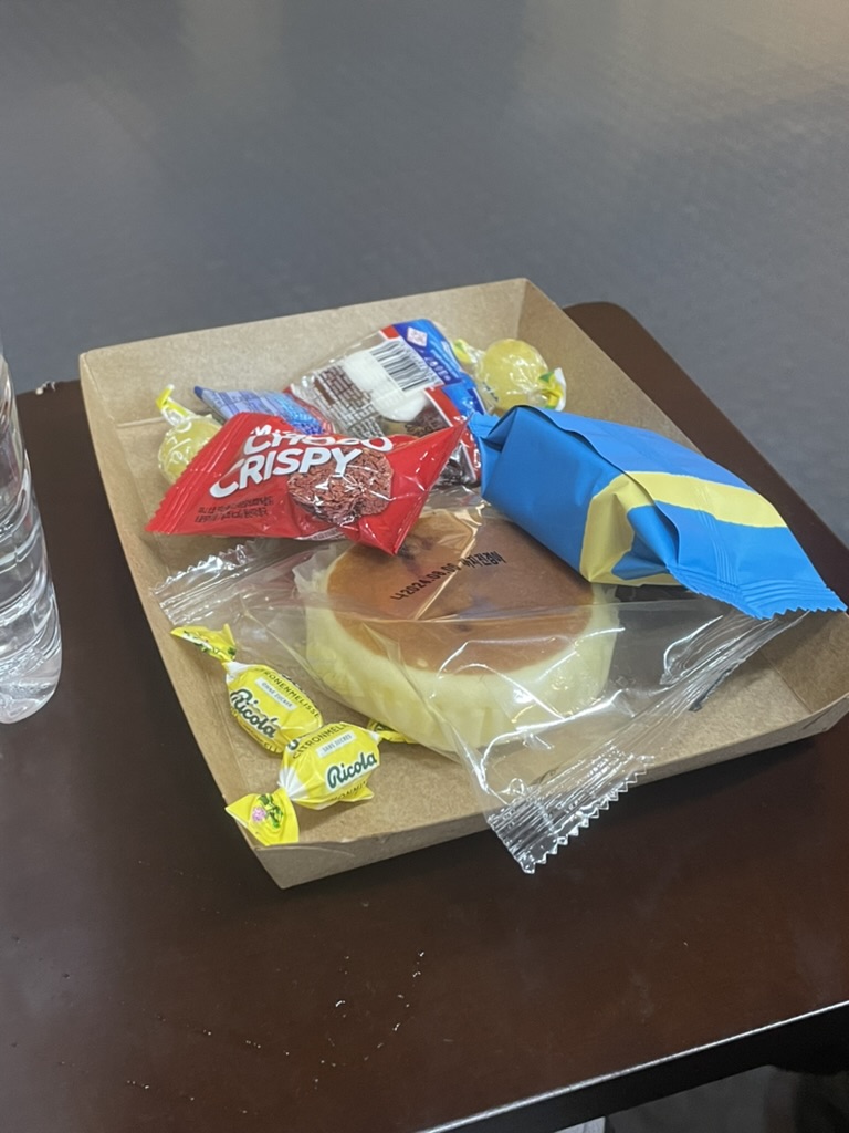 점심은 샌드위치와 과일을 주셨고, 간식은 뷔페식으로 무한리필로 제공되었다. 과자, 빵, 컵라면, 젤리 등등 먹을게 정말 많았다