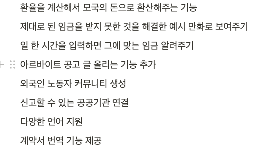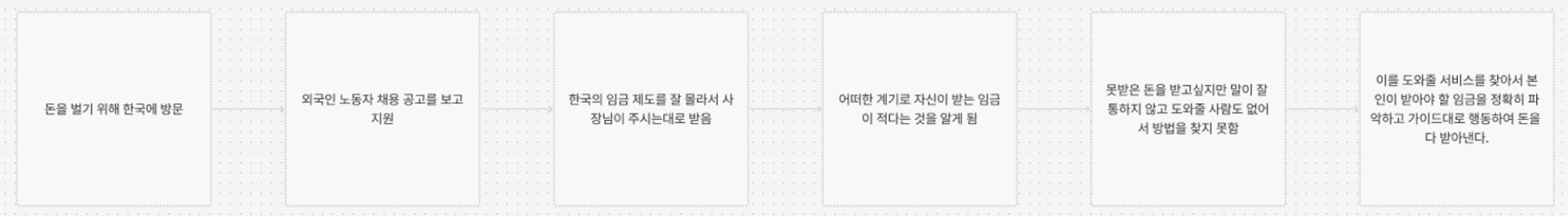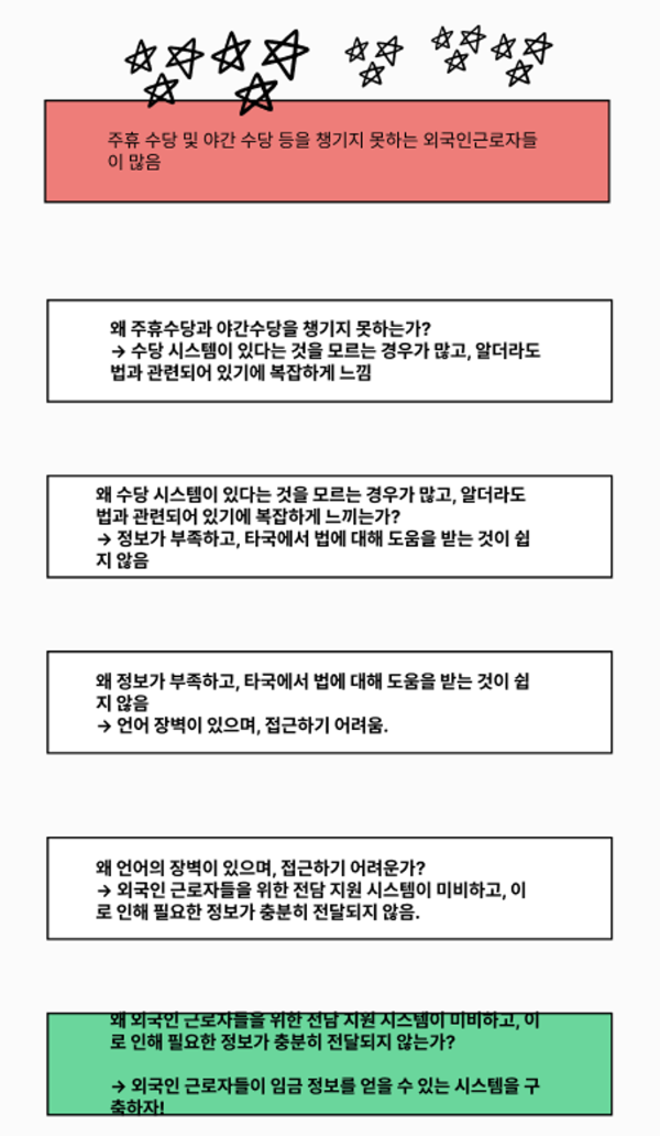우리 팀의 최종 5whys는 위와 같다. 팀원 분이 아르바이트를 하다가 위와 같은 문제를 겪고 있는 외국인 노동자를 만나셨다고 한다.
