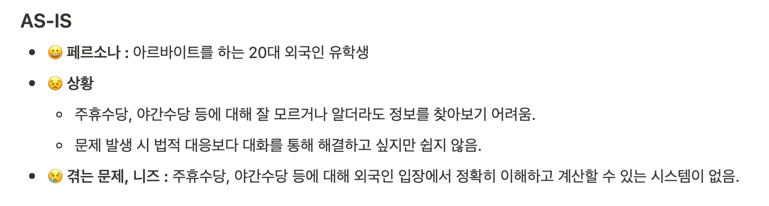 우리의 As-Is는 위와 같다. 페르소나로 아르바이트를 하는 20대 외국인 유학생을 선정했고 이들이 겪는 문제점을 적었다.