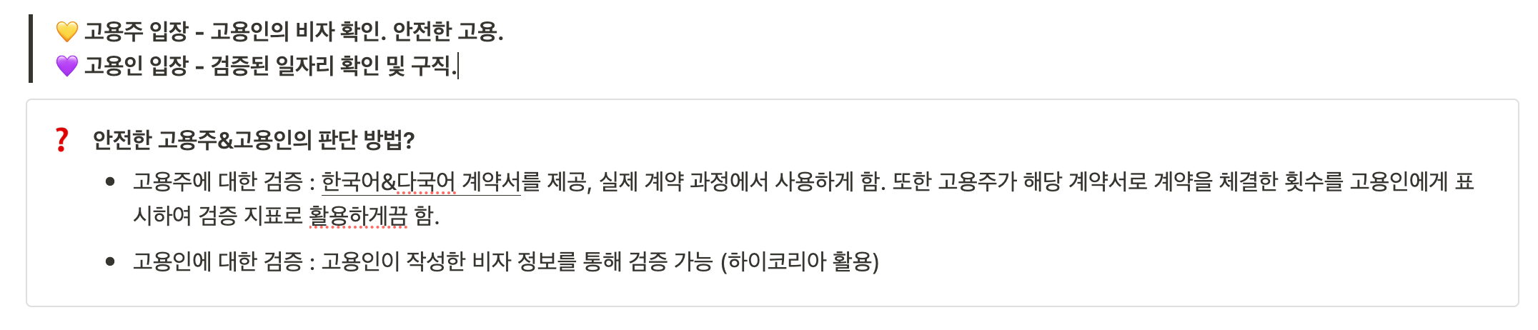 - 사업자 신뢰성 강화: 근로자가 계약서의 주요 사항을 정확히 이해할 수 있도록 번역된 유의사항을 제공하고, 고용주가 해당 서비스를 통해 계약한 횟수를 표시함으로써 계약의 신뢰성을 높인다.