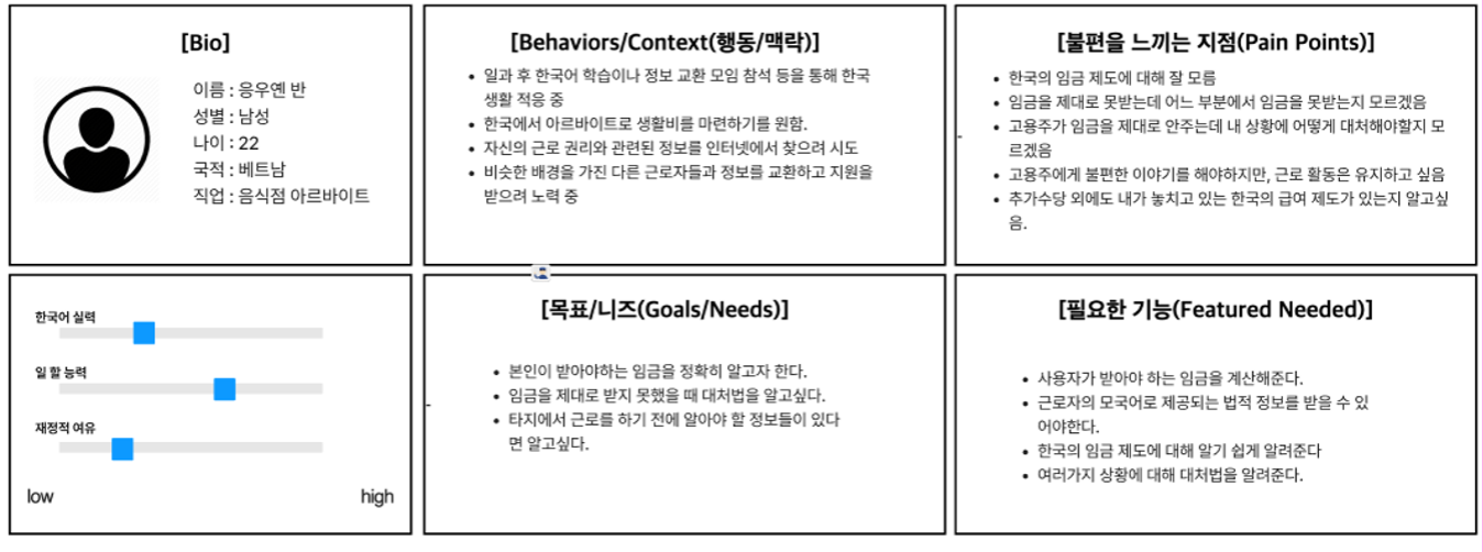 페르소나는 베트남 국적 남성으로, 언어적 문제로 인해 본인이 받아야 하는 임금과 관련 제도를 잘 몰라 어려움을 겪는 사람으로 정했다.