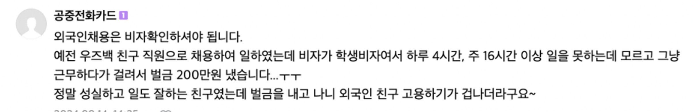 위 글처럼 외국인 노동자는 계약서를 써야 하는지도 몰라서, 또는 알고는 있지만 작성하지 않아서 위험에 노출되는 상황이 많다. 또한 근로계약서를 쓰지 않으면 추후에 임금 체불에 관한 문제가 생겼을 때 대처하기 매우 어려워진다. 뿐만 아니라 사장님도 계약서를 쓰지 않은 것이 적발되었을 때 벌금 500만원이 부과되기때문에 양측에 계약서를 쓰는 것은 매우 중요하다.