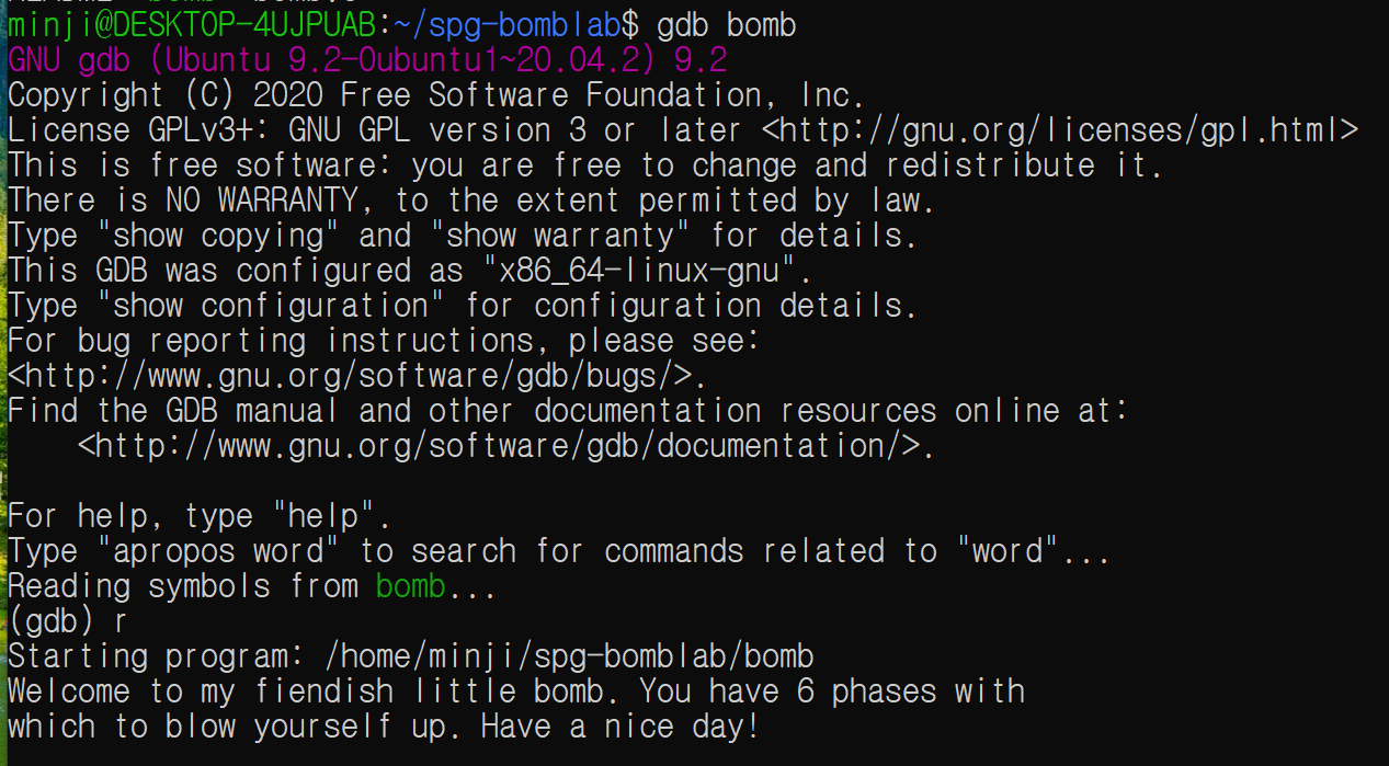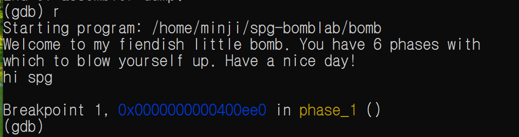 이렇게 bomb을 실행하고 r(run)명령어로 실행하면 환영 메세지가 나옵니다. 이제 이 밑에다가 phase_1의 정답을 찾아 입력하면 된다.