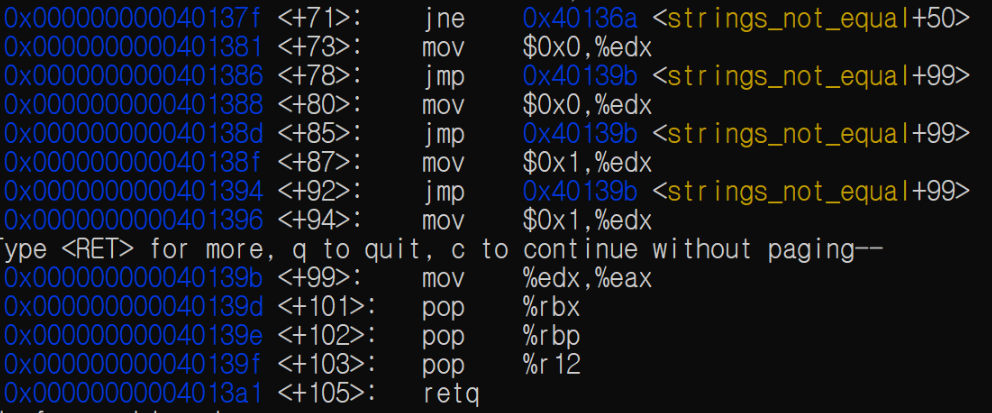 rax는 함수의 리턴 값이 저장되는 곳이다. 즉, string_not_equal의 리턴 값이 0이어야 한다는 것을 알 수 있다.