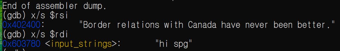 그럼 이 값들이 뭔지 확인해보겠다. 함수가 실행 된 후에는 rdi, rsi 값이 바뀌기 때문에 함수가 실행되기 전인 상태(phase_1의 <+4> 부분에 화살표가 위치할 때)에서 레지스터 값을 확인해야한다.