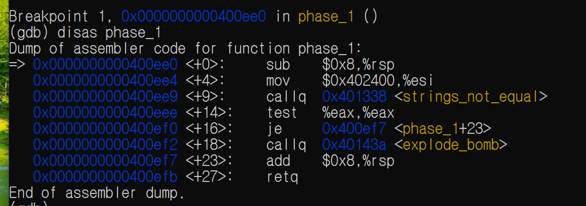 이를 위해서는 미리 phase_1에 breakpoint를 걸어두고 실행한 후 정답을 입력해보면 된다.