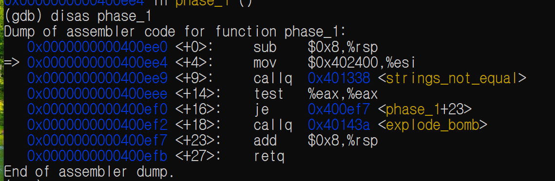 이를 위해서는 미리 phase_1에 breakpoint를 걸어두고 실행한 후 정답을 입력해보면 된다.