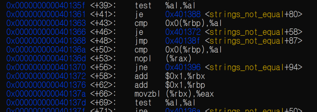 그리고 rbp를 1씩 계속 더해가는 것도 볼 수 있다. 이로서 rbp에 있는 값과 eax에 있는 값이 다르면 폭탄이 터진다, 즉 처음으로 돌아가면 rsi와 rdi에 들어가는 값이 같아야한다 라는 것을 알 수 있다.