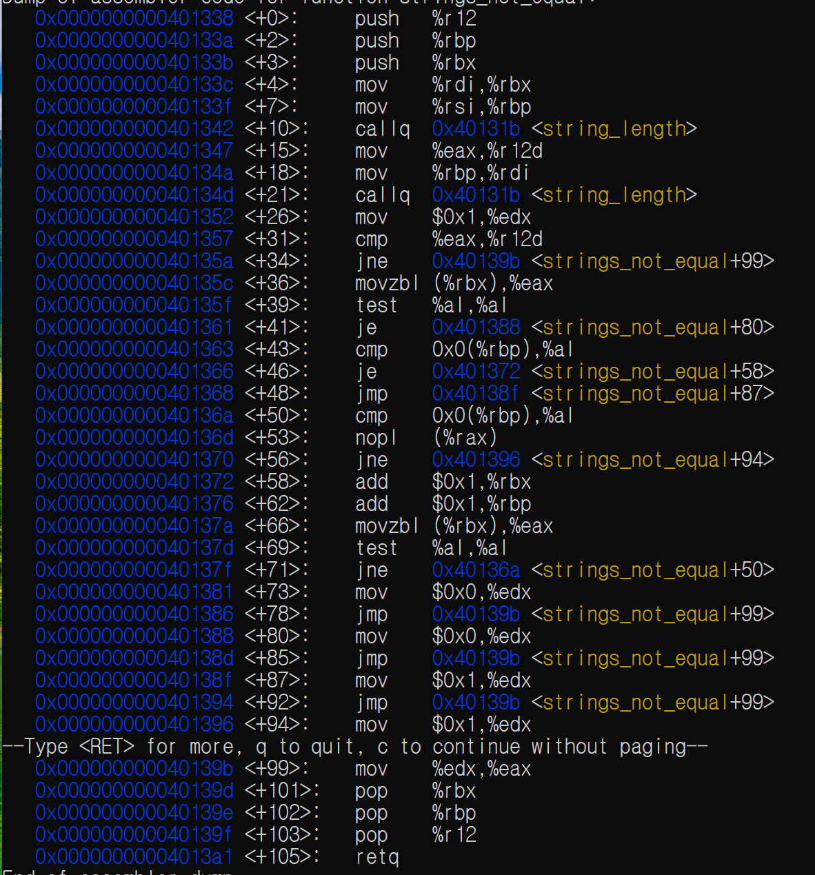 rax는 함수의 리턴 값이 저장되는 곳이다. 즉, string_not_equal의 리턴 값이 0이어야 한다는 것을 알 수 있다.