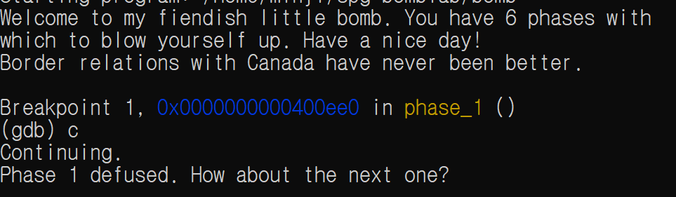 phase_1에 breakpoint가 걸렸지만 c(continue) 명령어로 쭉 실행하도록 하였더니 성공 메세지가 떴다.