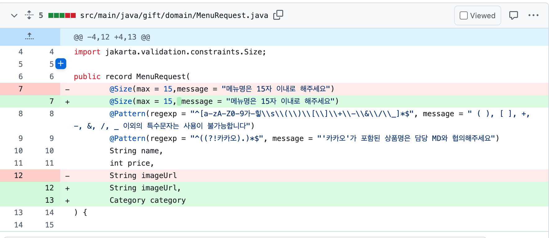 나는 menuRequest라는 DTO 안에 Category를 그대로 넣었다. 그랬더니 Category도 DTO를 따로 만들어주는 것이 좋을 것 같다는 피드백을 받았다.