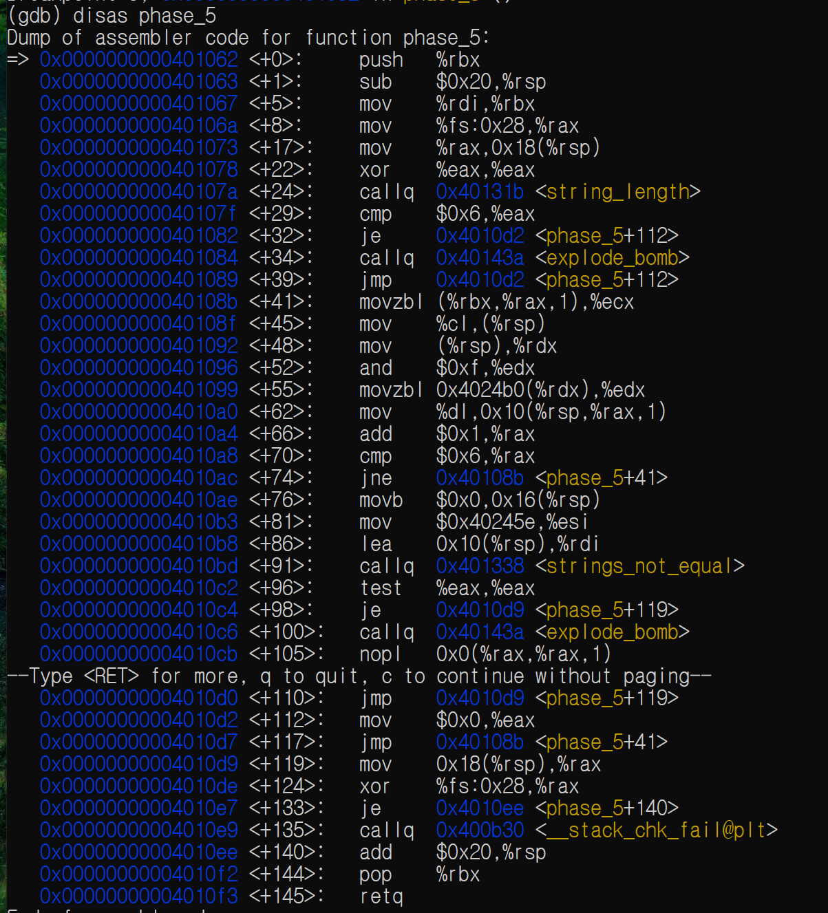 <+24>를 보면 string_length를 호출하고 리턴값인 eax의 값이 6인지 확인한다.