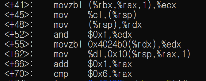 55번에서는 0x4024b0으로부터 rdx의 끝 4비트 만큼 떨어진 주소의 값을 edx에 넣는다.
