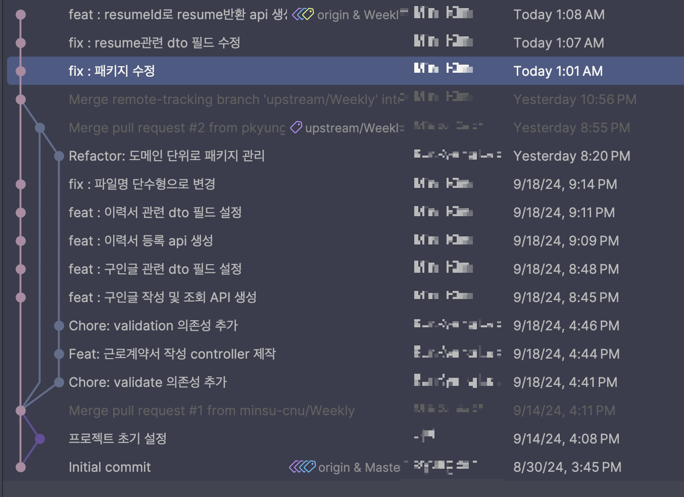 우리 팀의 패키지 규칙이 바뀌어서 한 팀원분이 이를 구현하여 PR을 날려주셨고, 이를 테크리더님이 merge 해주셨다.