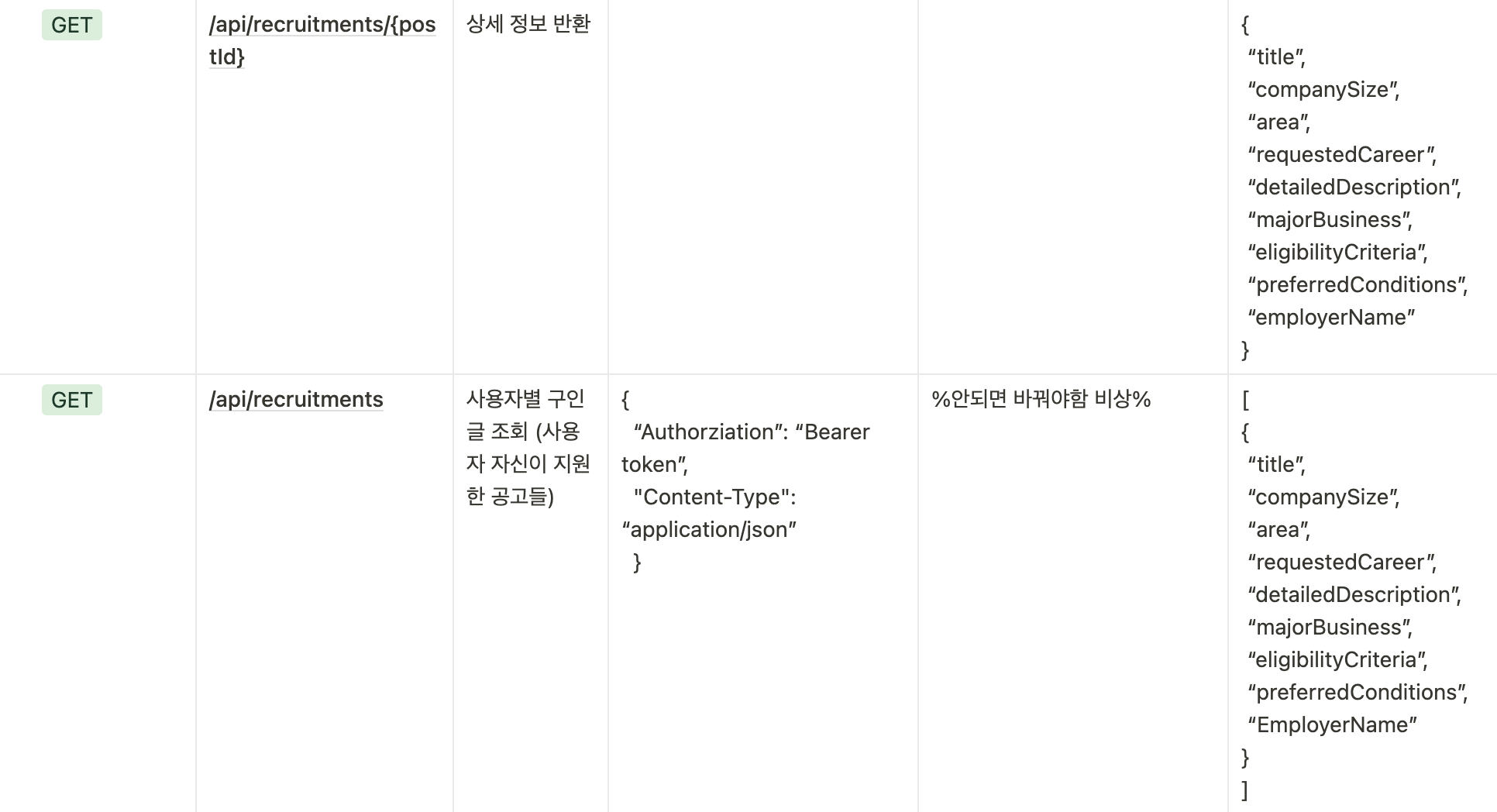 우리가 해결해야 할 것은 구인글을 조회할 때 모든 정보를 반환할 때랑 개인별 정보를 반환할 때랑 endpoint가 같다는 것이다. 처음에는 경로변수로 id를 받으면 되지 않나? 라고 생각했는데, 클라이언트는 사용자의 id값이 아닌 토큰만 가지고 있어서 이는 불가능하다. 현재는 헤더에 토큰이 있냐, 없냐로 구분해두었는데 이게 잘 구현될지는 모르겠다. 우선 구현해보고 안되면 다시 회의해보기로 했다
