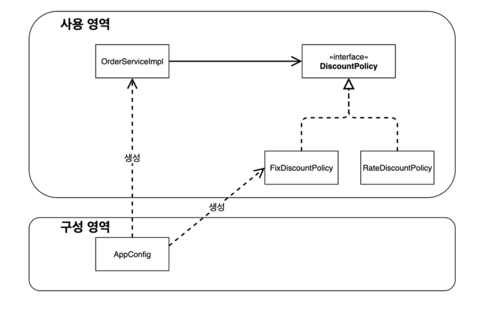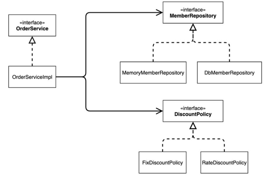 위 다이어그램에서 OrderServiceImpl이 MemberRepository와 DiscountPolicy에 의존한다는 것은 고정된 사실이다.
