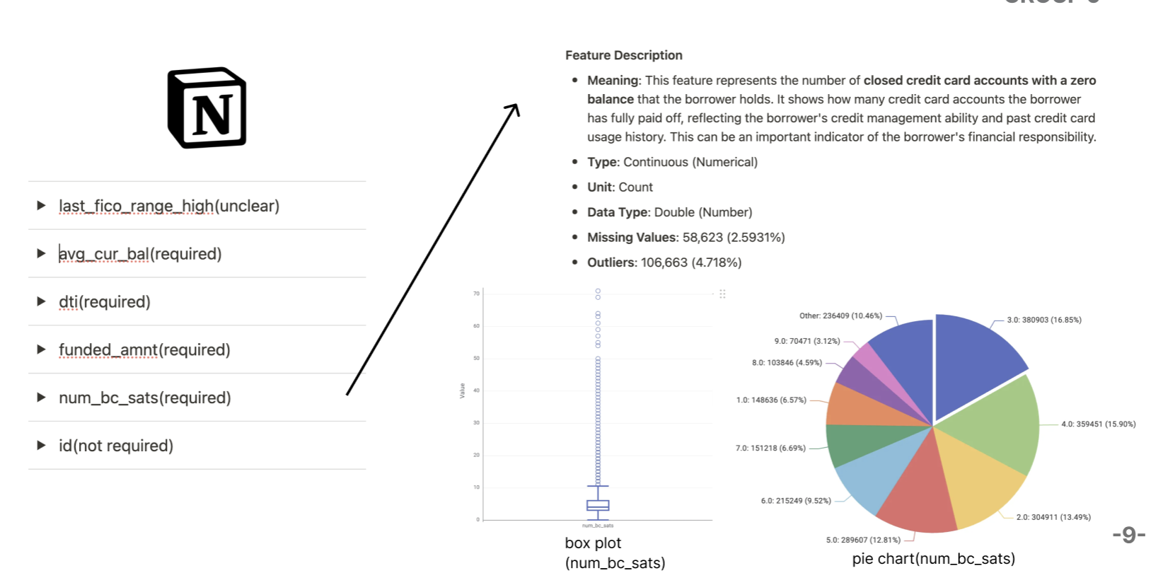 노션에 150개의 피쳐들을 토글로 만들고, 각각의 페이지에 피쳐의 의미, 타입, 단위, 데이터타입, 결측치 수와 비율, 이상치 수와 비율을 적었고,