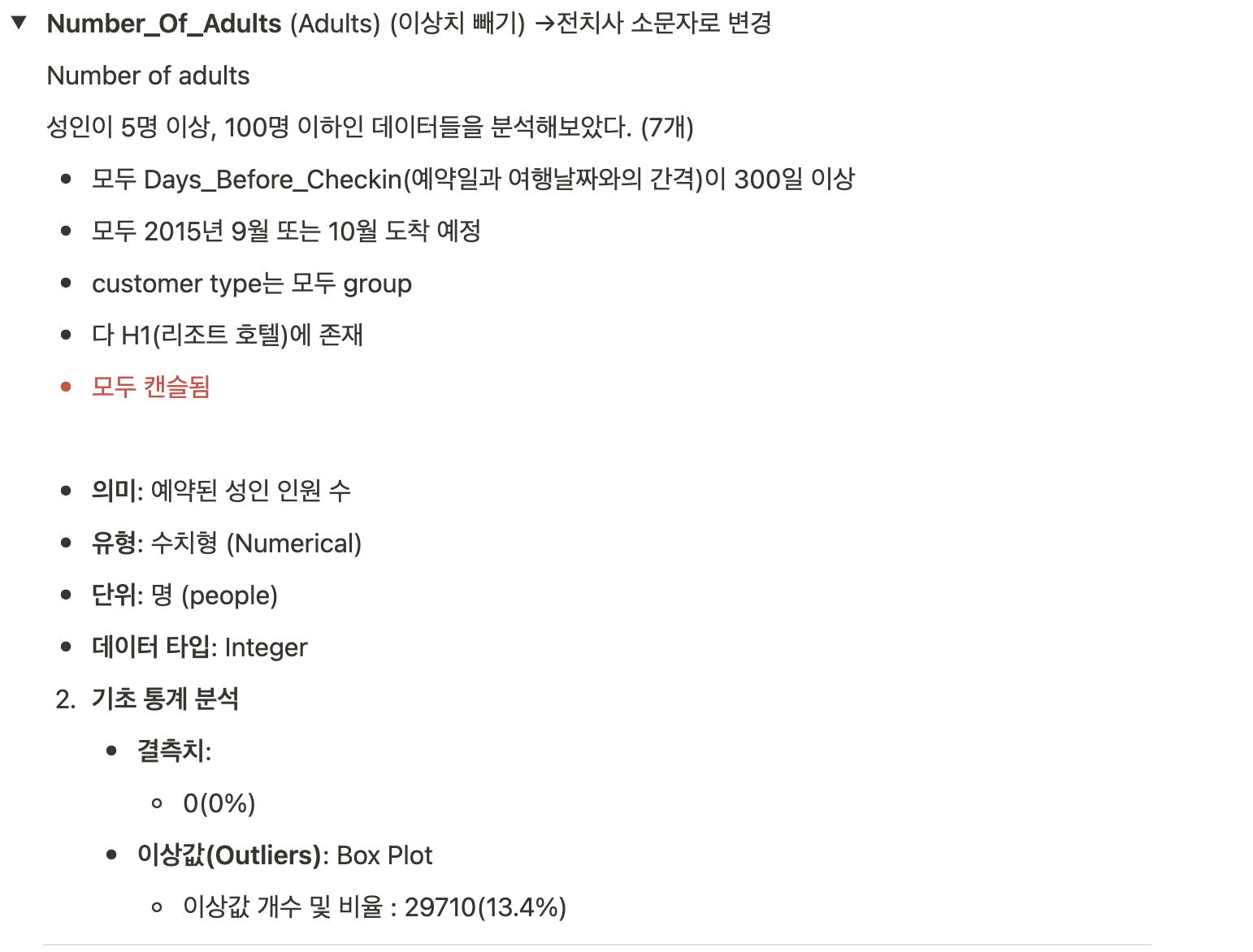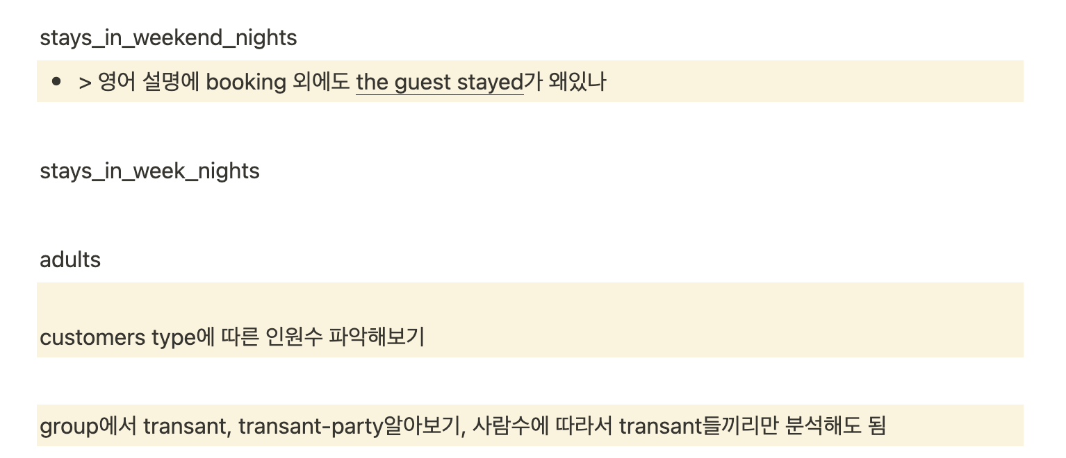 박사님께서 이상치가 있는 것들은 그 값을 분석해서 정말 이상치인 것들은 제거하라고 하셨고 결측값이 많거나 예약 취소와 관련 없는 피쳐들은 빼라고 하셨다.