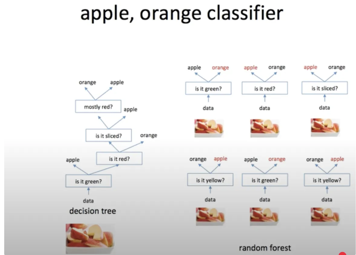 여기서 디시전트리는 트리 하나라서 사과로 결론을 냄