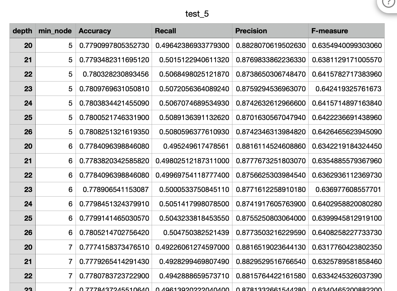 우선 depth와 min_node를 조절하면서 가장 좋은 값을 찾고자 하였고