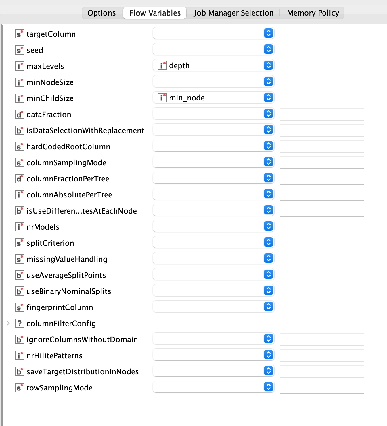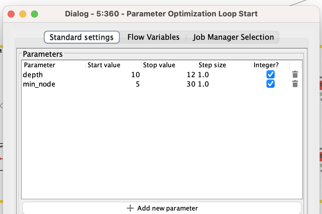 random forest learner 노드 내의 flow variables에서 위와 같이 설정해주면 해당 범위 모두를 돌게 된다.(정말 오래걸린다)